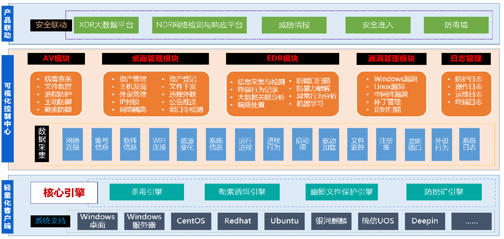 全面防护:系统集成了防病毒、EDR、桌面管理、漏洞修复、日志审计、数据防泄密等多种安全功能模块,用户可根据自身需求灵活选择,按需定制安全能力。