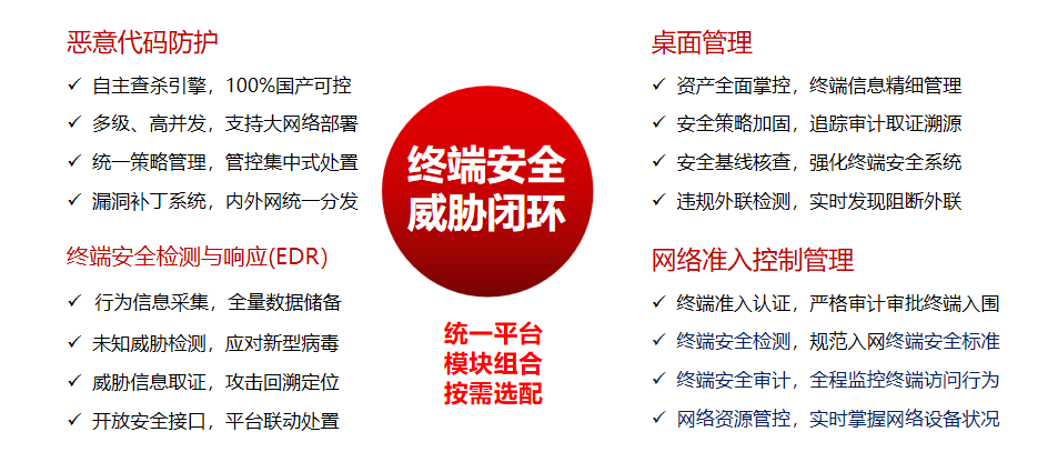 江民赤豹近卫终端安全防御系统(简称赤豹EPP)是面向政企单位推出的一体化终端安全解决方案。该产品集恶意代码防御、漏洞修复、检测与响应(EDR)、桌面管控等功能于一体,兼容不同操作系统和计算平台,基于单一代理、单一管理控制台帮助客户建立面向已知和未知威胁防护以及统一管控、高效运维的新一代终端安全立体防护体系。