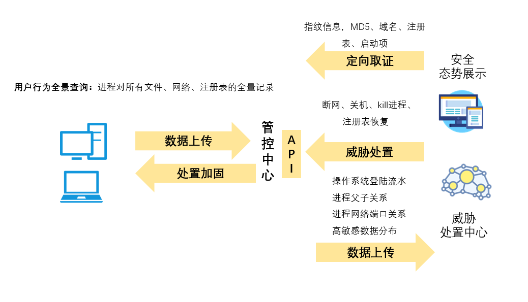 针对企业网络所面临的未知威胁,通过客户端代理采集终端资产的指纹信息,实时监测终端行为,通过与态势平台的联动对恶意事件进行及时响应处置,让未知威胁无处藏身。