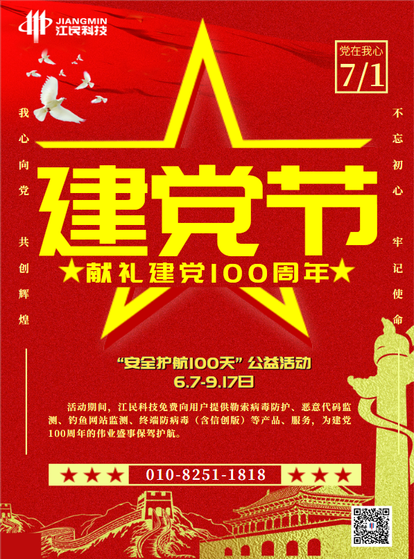 2021年是中国共产党建党100周年,也是“十四五”规划开局之年,值此举国同庆党的百年诞辰之际,加强网络安全风险排查,全力筑牢安全防线是网络安全工作的重要部署之一。江民科技特别举办建党100周年献礼——“百年华诞 安全护航100天”公益活动,并面向政府机关、军队军工、国有企事业、关键基础设施服务等重点单位开展专项保障计划。