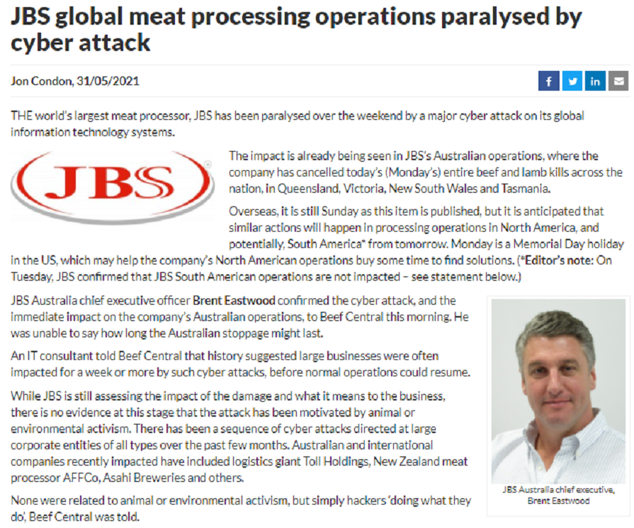 当地时间5月31日,全球最大肉类供应商JBS宣布遭到黑客攻击,多家工厂牛羊屠宰业务被迫暂停,超过1万名员工被迫无薪休假。