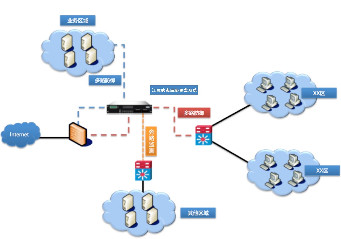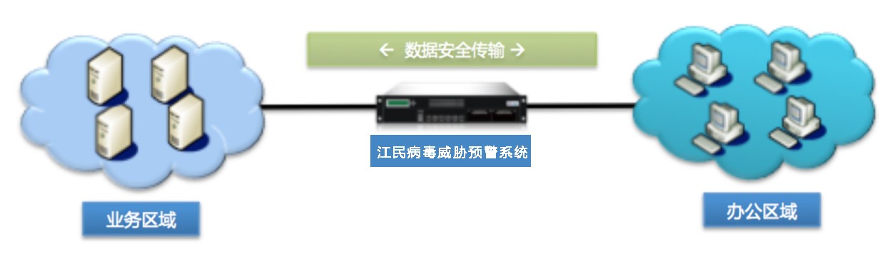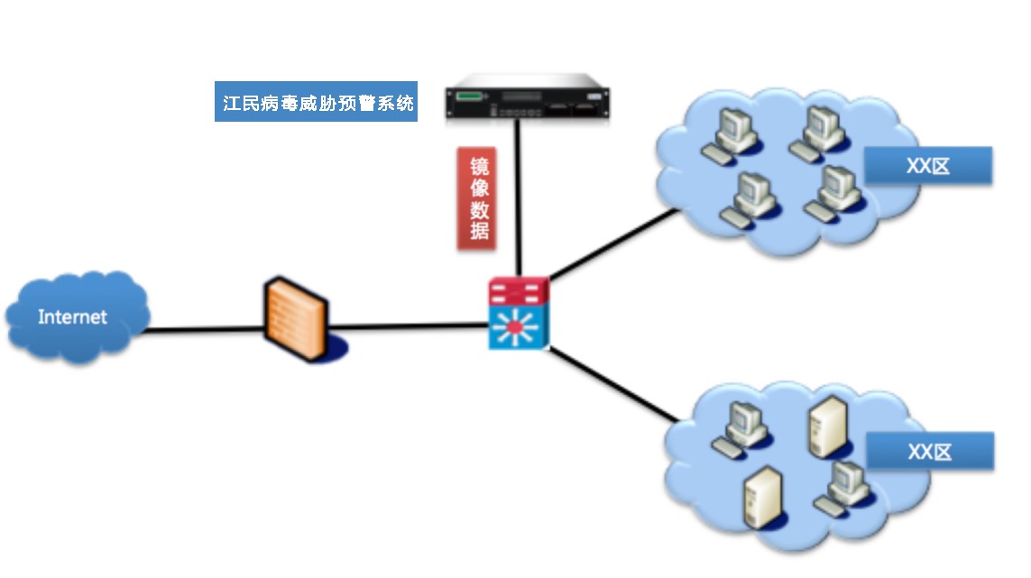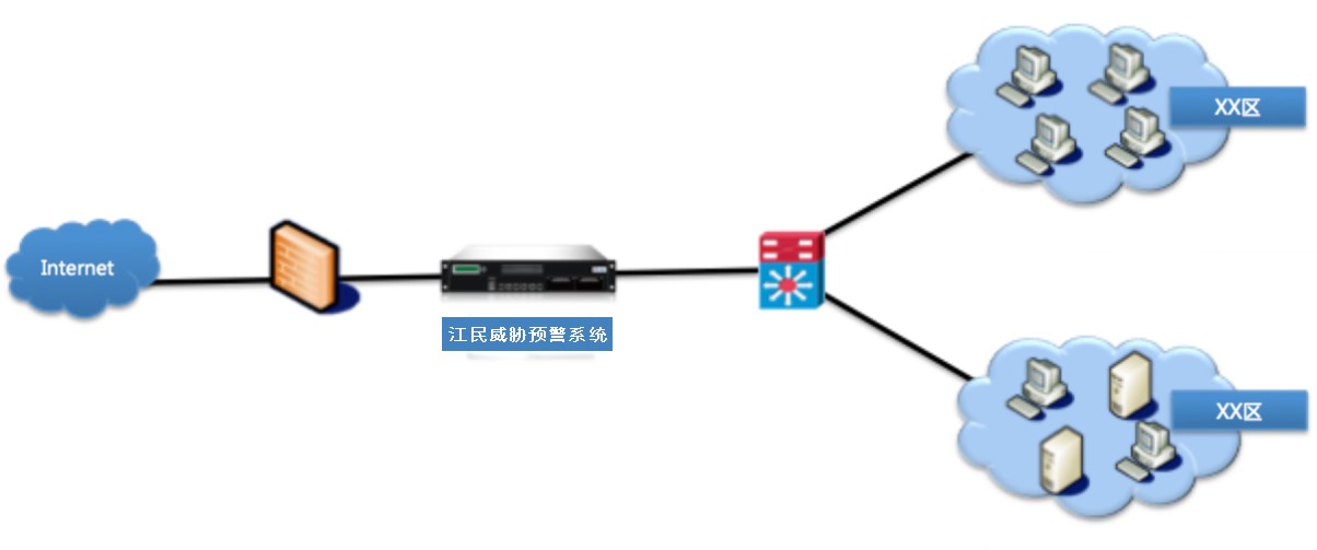 ● 部署:串行阻断防御--江民病毒威胁预警系统串联到关键网段前面。