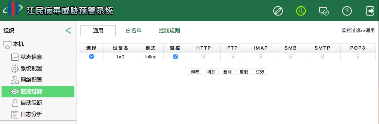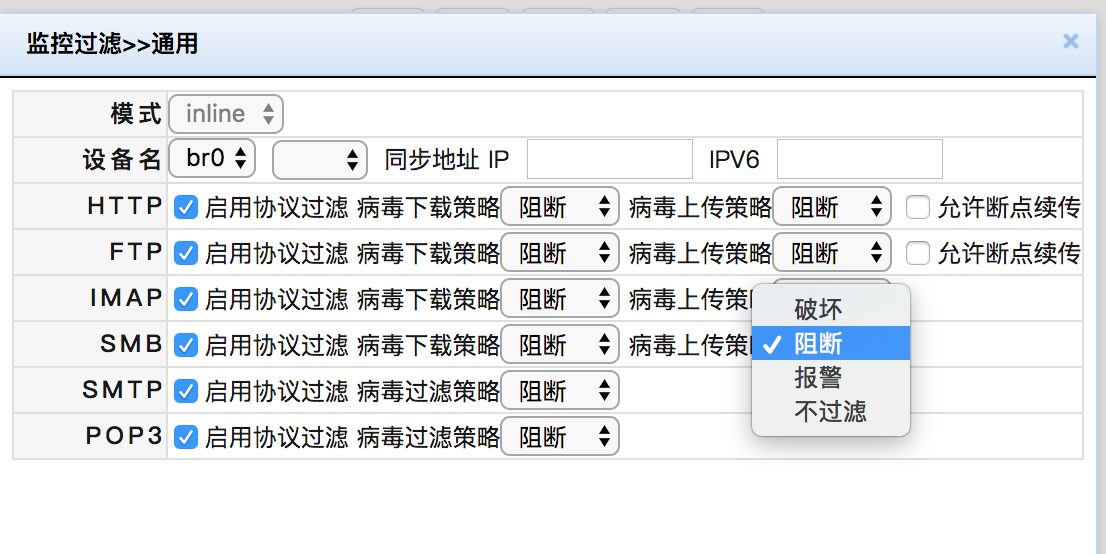 3. 开启“监控过滤“策略,实现协议层病毒过滤;
