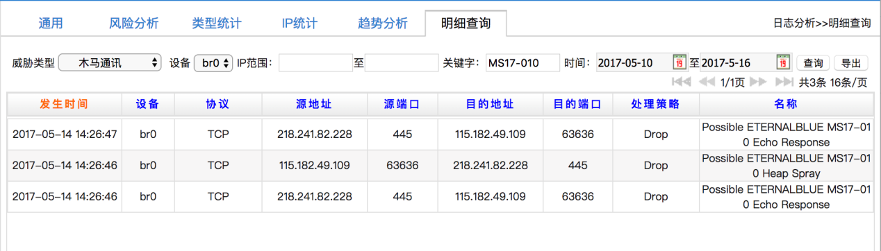 针对Wannacrypt勒索病毒,发起的漏洞攻击,网关可进行实时阻断,并告知用户此漏洞所利用漏洞编号为MS17-010