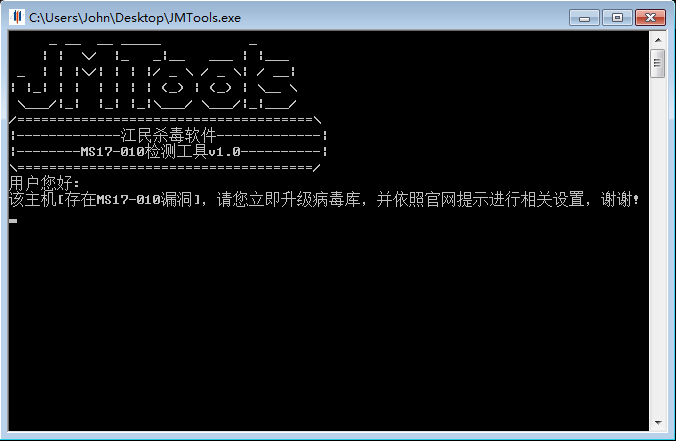 准备一个U盘或移动硬盘,周一上班前,可以在安全网络环境下,下载江民“敲诈者”免疫工具,下载地址:http://www.jiangmin.com/uploads/soft/JMTools.exe