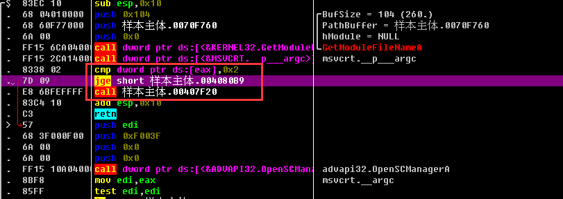 进入病毒主函数,判断参数如果小于2,则进入安装服务,否则进入执行服务