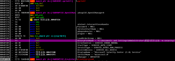 进入安装流程,创建服务,服务名称: mssecsvc2.0,参数为当前程序路径 –m security