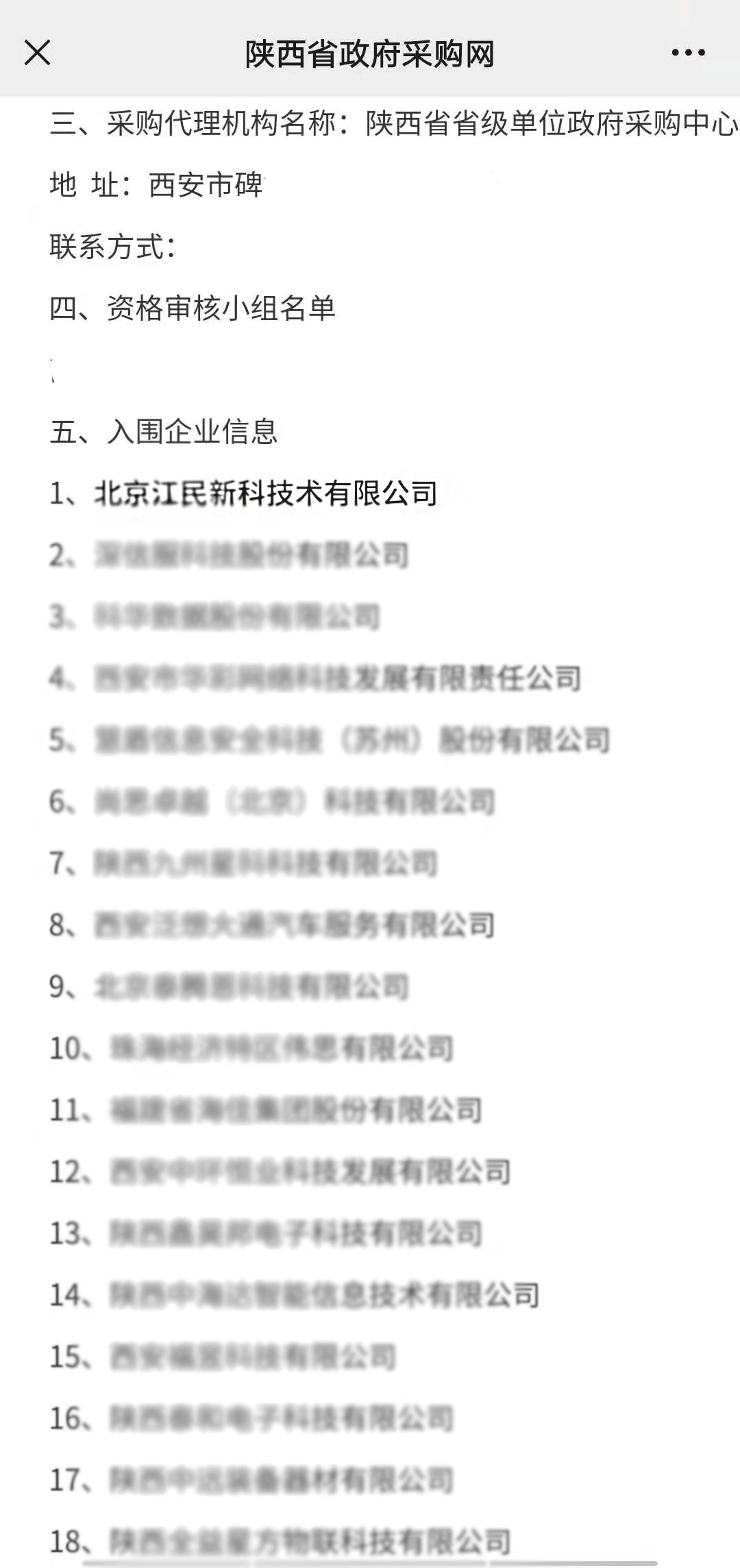 这是今年江民科技继入围央采、中直机关、北京市政府采购和多地省市级政府采购后再次入围陕西省政采。至此,江民科技旗下产品又一次全面入围央采、中直机关、北京市政府采购和省市级政府采购。