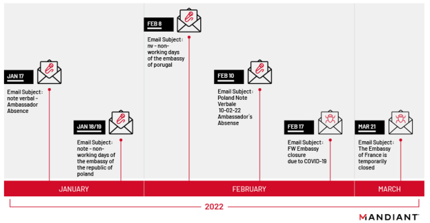 - 从2022年1月中旬开始,APT29使用BEATDROP和BOOMMIC下载器的部署。在识别此活动后不久,Mandiant发现了APT29通过一系列网络钓鱼浪潮发起的针对多个其他外交和政府的攻击。