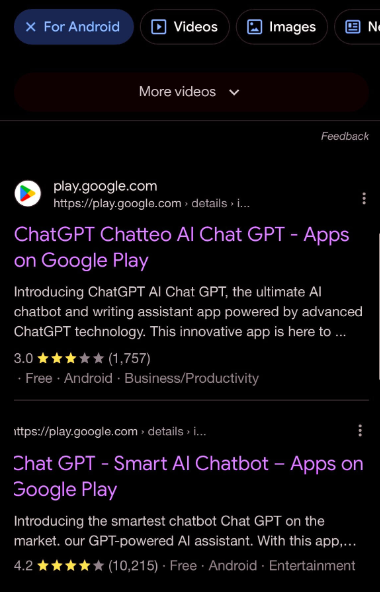 2、黑客在Google play和第三方Android应用商店推广虚假的ChatGPT应用,借此将恶意软件推送到用户设备上运行。