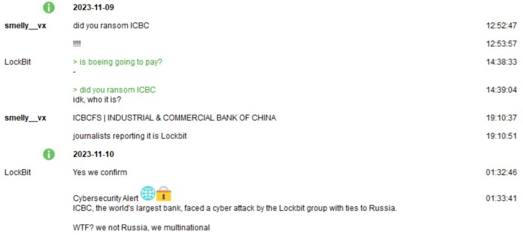 最近几日,X社交媒体(原Twitter)上流出了黑客组织在某安全研究平台VXunderground上发布 LockBit 组织代表在 Tox 上公开确认针对ICBCFS 的攻击行为,如下图所示: