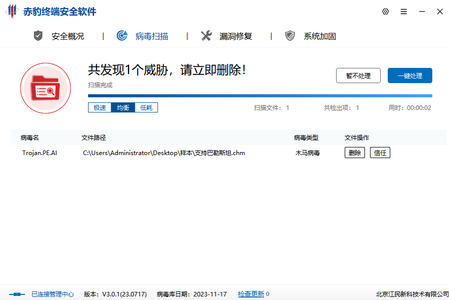 1、安装江民反病毒产品并将病毒库升级为最新版本,并定期进行全盘扫描。