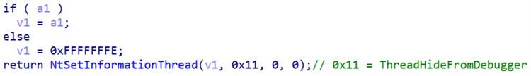 1、该样本文件具有反调试功能,通过使用未导出函数实现了两种反调试手段: 第一种通过设置线程状态来实现对调试器隐藏。